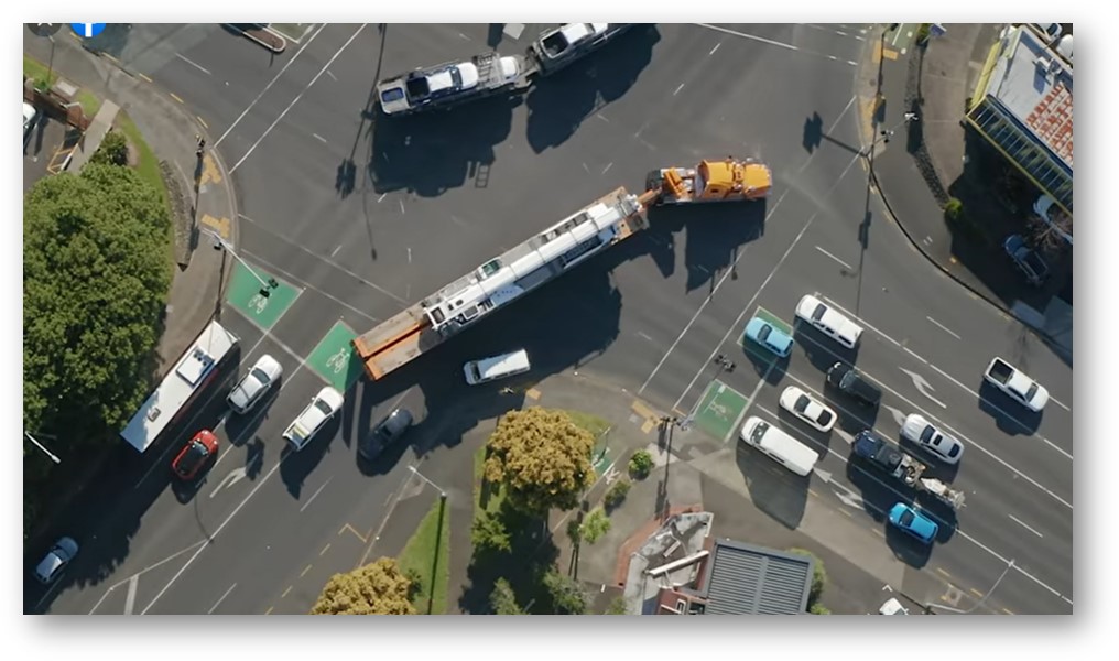 The maneuverability of TRT’s patented ESS steering system is seen with all axles steering easily through Auckland’s bustling Mount Eden and then onto the Southern Motorway to Hamilton.